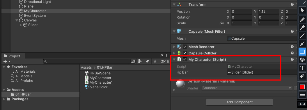 MyCharacter 오브젝트에 아래와 같이 MyCharacter.cs 스크립트를 작성해서 AddComponent 로 추가해 놓는다.