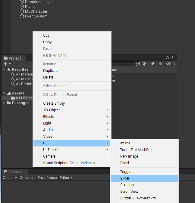 다른 UI들과 같이 RenderMode 가 Screen Space - Overlay 인 Canvas 를 생성하고 하위에 Slider 를 두는 방식으로 구현해 본다.