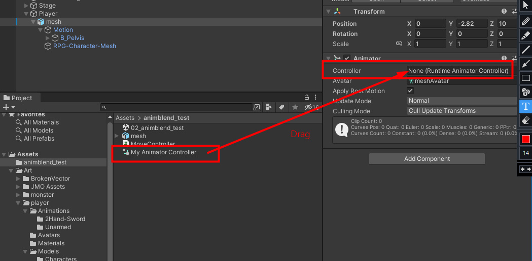 위 캐릭터의 Hierarchy 에서는 Player 라는 빈 오브젝트에 mesh 오브젝트를 추가했고, 이 mesh 에는 Animator 컴포넌트만 붙어 있는 상태이다.